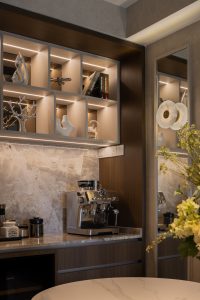 The kitchen was designed to align seamlessly with the home’s modern contemporary luxe concept. Clean carpentry lines and functional planning ensure the space remains practical for daily use while maintaining a sleek and uncluttered appearance. The absence of wallpaper allows the finishes and detailing to stand out naturally.