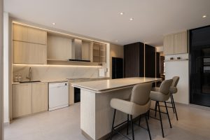 The kitchen followed the same modern luxury theme, with carpentry designed to be clean and streamlined. Functional planning was prioritised to support daily use, while maintaining a polished and uncluttered appearance. The absence of wallpaper allows the materials and finishes to stand out as key design features.